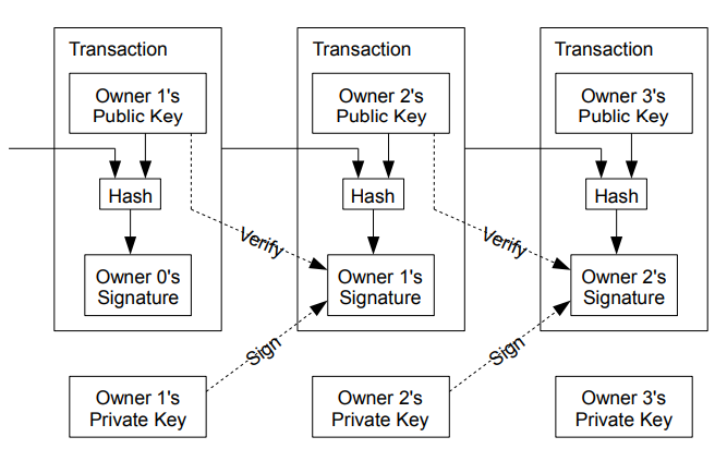 各所有者は、一つ前のトランザクションおよび次の所有者の公開鍵のハッシュに対しデジタルに署名しコインの最後に付け加えることで、次の所有者へコインを譲渡する。受取人は、所有権のチェーンを証明してくれるそれらの署名を検証できる。