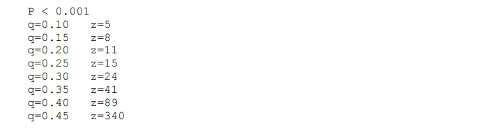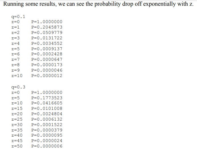 いくつか実行してみると、zが増えるにしたがって確率が指数関数的に下がっていくことが分かる。