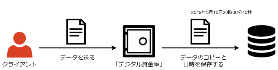 「デジタル貸金庫」は、クライアントが通信回線を通してデータを送ると、データをまるごとコピーして日時とともに保存します。後日、そのデータがその日時に存在していたこと、改ざんされていないことの確認が必要になったら、保存しておいたコピーおよび日時と突き合わせる。