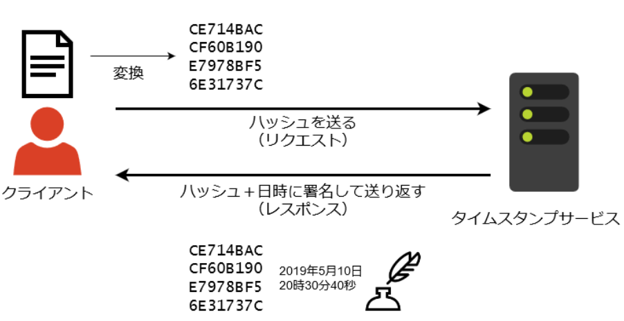 ハッシュとデジタル署名を用いて改良したタイムスタンプサービスを図示