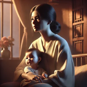 DALL·E 2025-03-29 12.34.33 – A realistic and emotional digital painting of a mother with bonding disorder, sitting in a softly lit room. She is holding her baby in her arms but lo