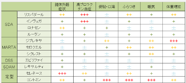 MARTAではセロトニン2cやH1受容体遮断による食欲亢進、体重増加や高血糖などの副作用が特徴的。