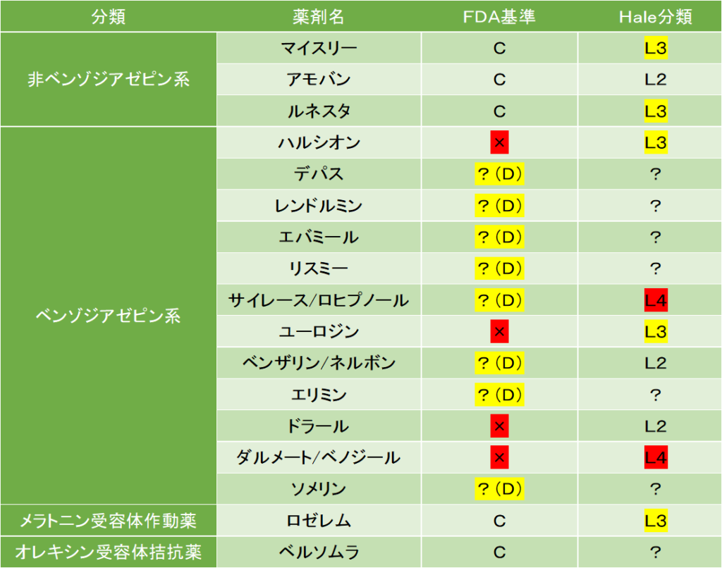① 非ベンゾジアゼピン系 → マイスリー、アモバン、ルネスタ ② ベンゾジアゼピン系 → 超短時間 ハルシオン 短時間 レンドルミン、リスミー、デパス、サイレース 中時間 ユーロジン 長時間 ドラール ③ メラトニン受容体作動薬 → ロゼレム ④ オレキシン受容体拮抗薬 → ベルソムラ、デエビゴ ⑤ バルビツール酸系