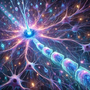 DALL·E 2025-03-03 16.53.18 – A mystical illustration depicting the transmission of membrane potential changes in a neuron. The image shows sodium ions flowing into the cell membra