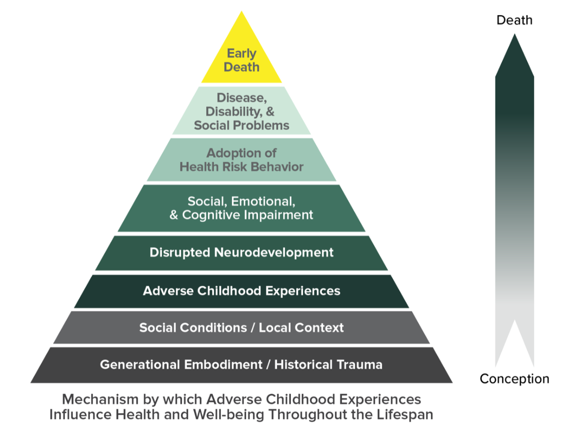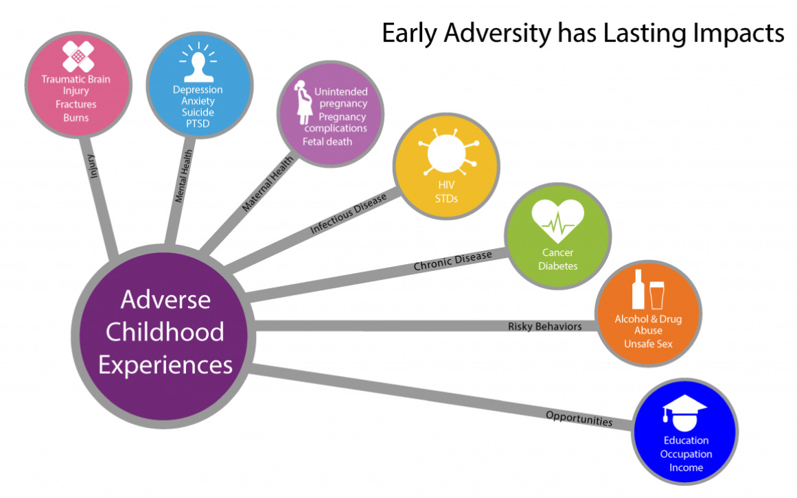 ACEs、さらに最近だと貧困や母子家庭などのリスク因子が、様々な疾患やearly deathに影響しているということを表しています。